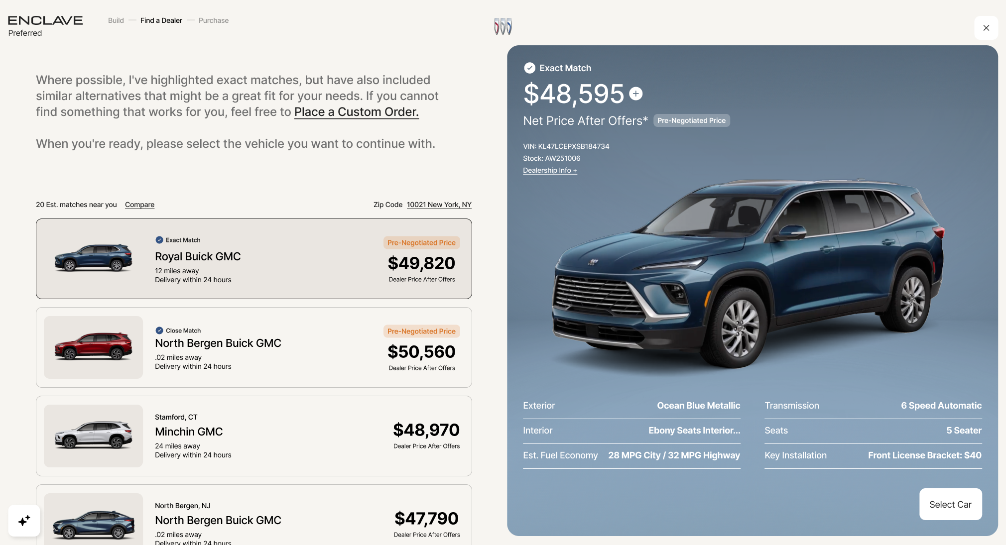 After a user completes vehicle customization, the AI assistant uses their selected configuration to curate dealership options based on: