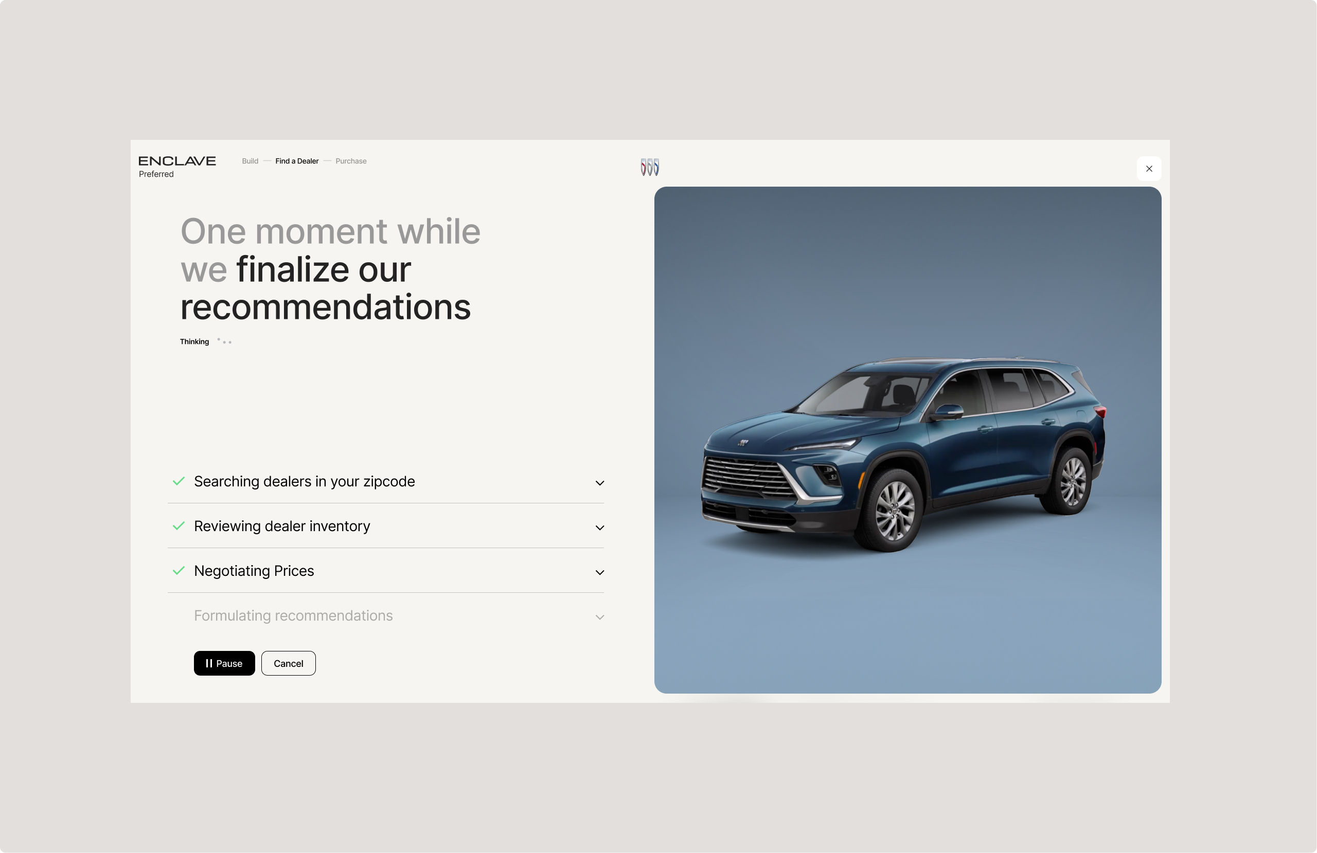 Following early exploration work for GMC, the client requested that Buick become the first brand to bring the AI-integrated website vision closer to reality. In this validation sprint, we adapted our conversational AI framework to Buick.com, focusing specifically on the transition from vehicle customization to dealership selection and purchase. The goal was to streamline a traditionally complex and overwhelming process into a guided, intelligent experience ready for further development.