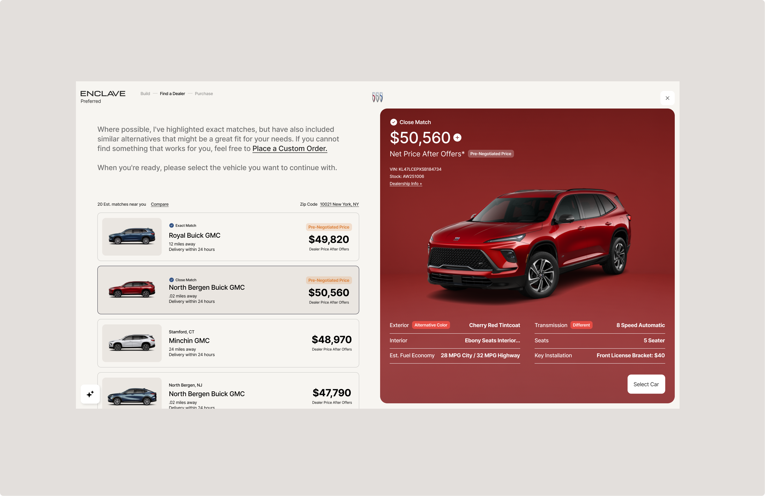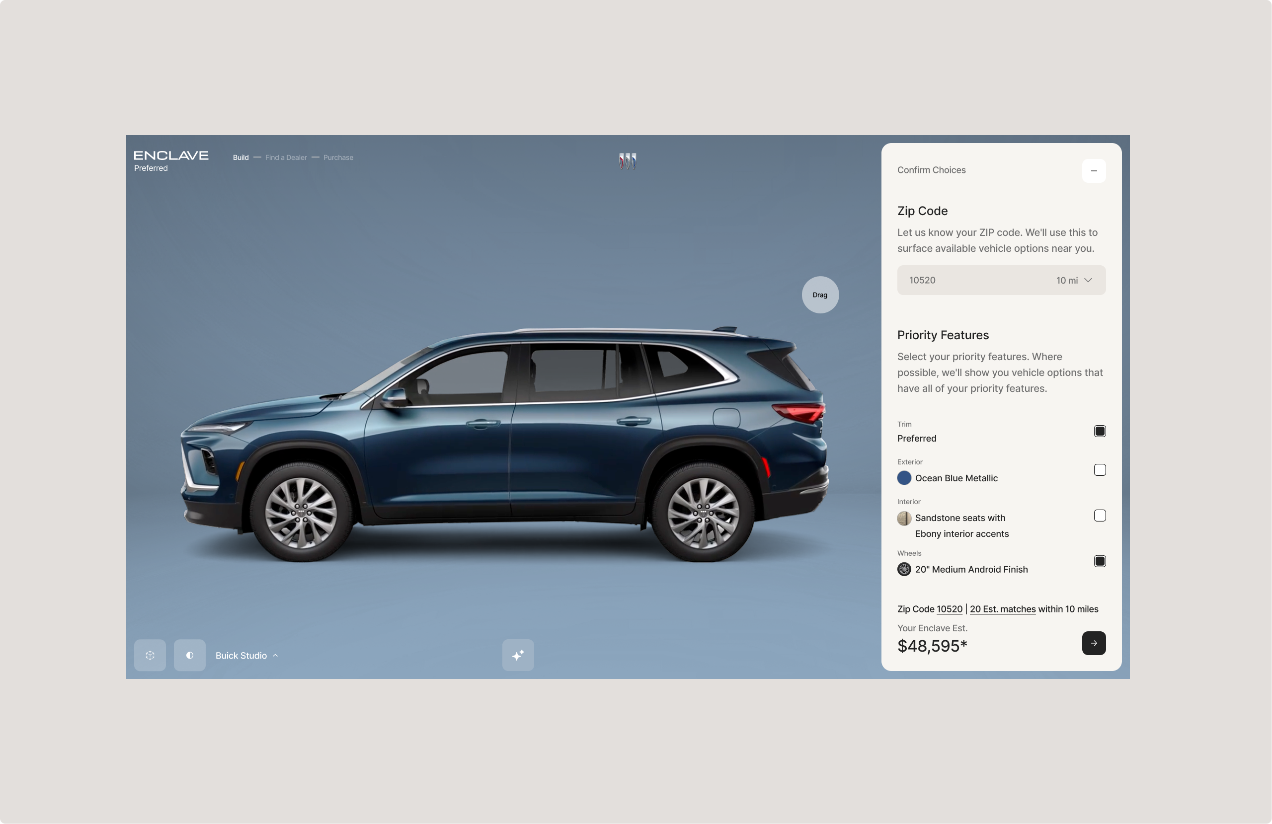 Stakeholders responded strongly to the clarity and prominence of the selected vehicle within the layout. The concept successfully won internal approval, and Buick was chosen as the first brand to move forward with fully fleshing out the AI-driven purchase vision beginning in 2026.