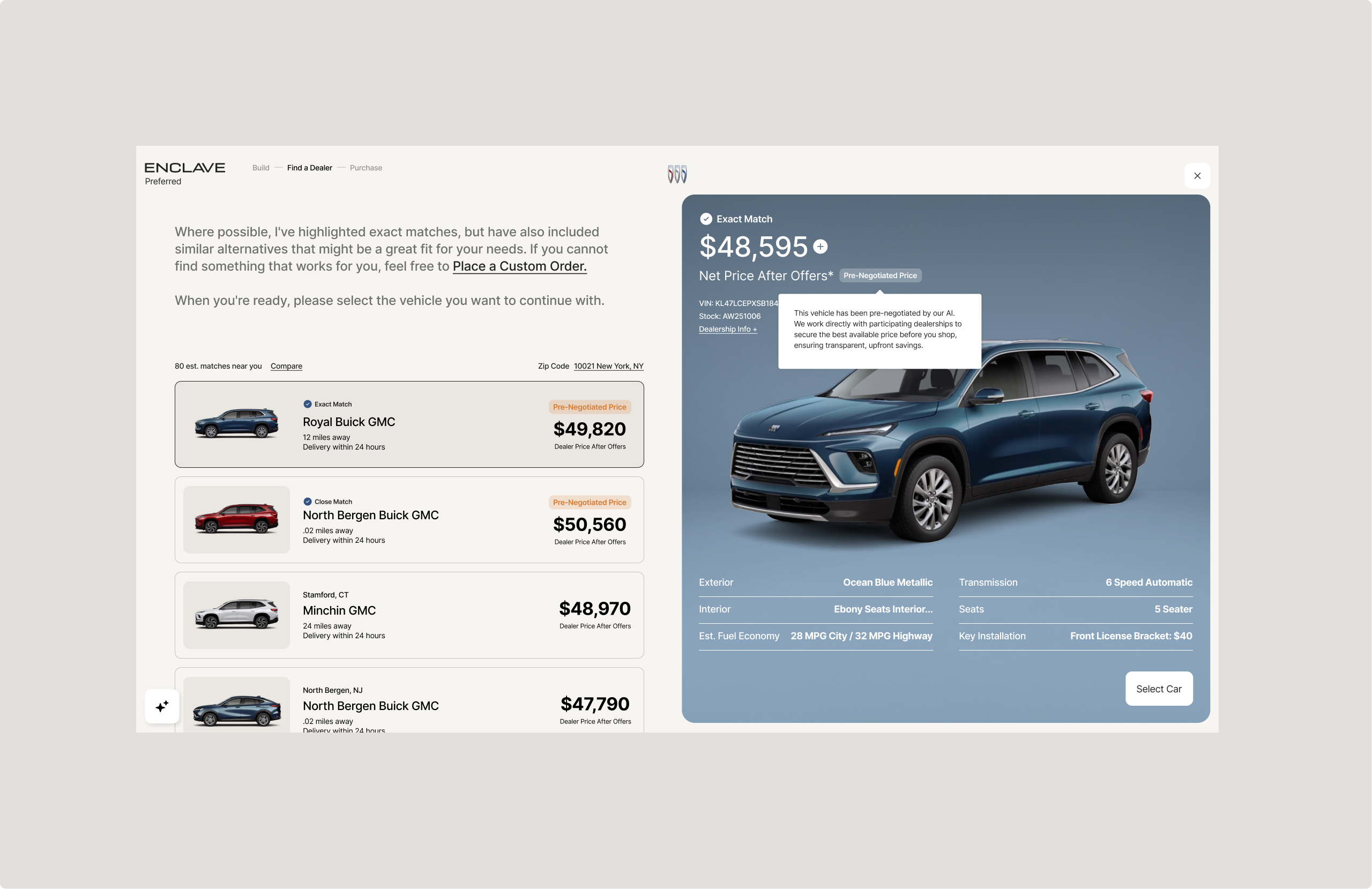 Rather than simply listing inventory, the AI pre-negotiates pricing ranges and surfaces the most relevant options before submission to a dealership. This reduces friction and increases user confidence.