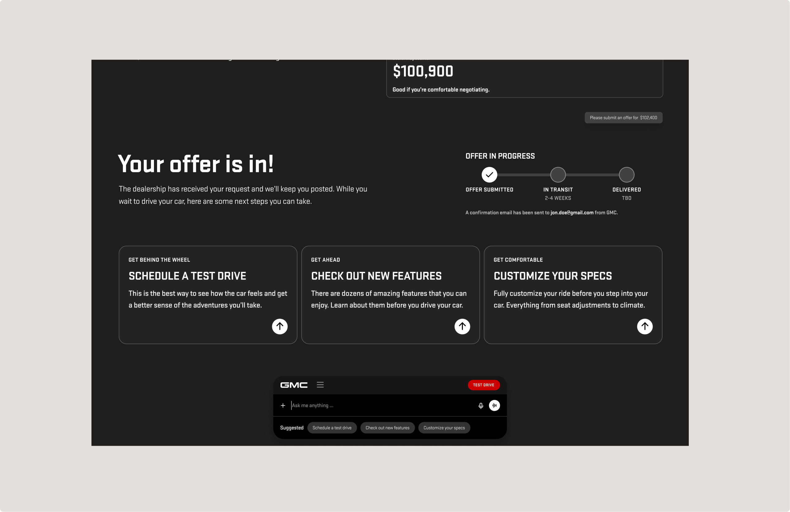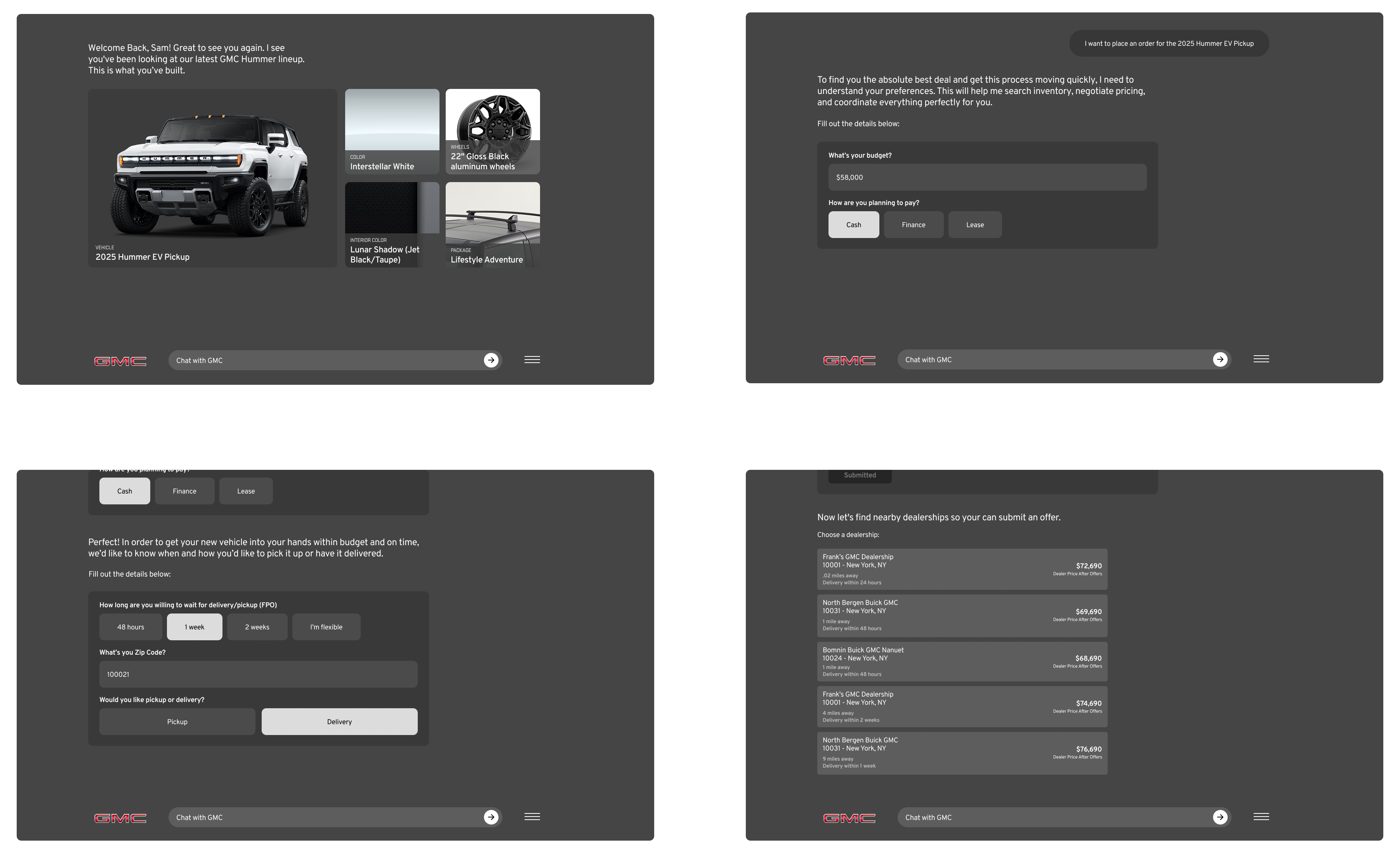 As part of the broader GMC AI-forward website redesign, our team explored what the vehicle customization and purchase journey could look like in an agentic, AI-integrated world. In this three-week sprint, we reimagined how users would move from researching a vehicle to customizing and placing an order — shifting the experience from a traditional configurator to a guided, conversational journey.