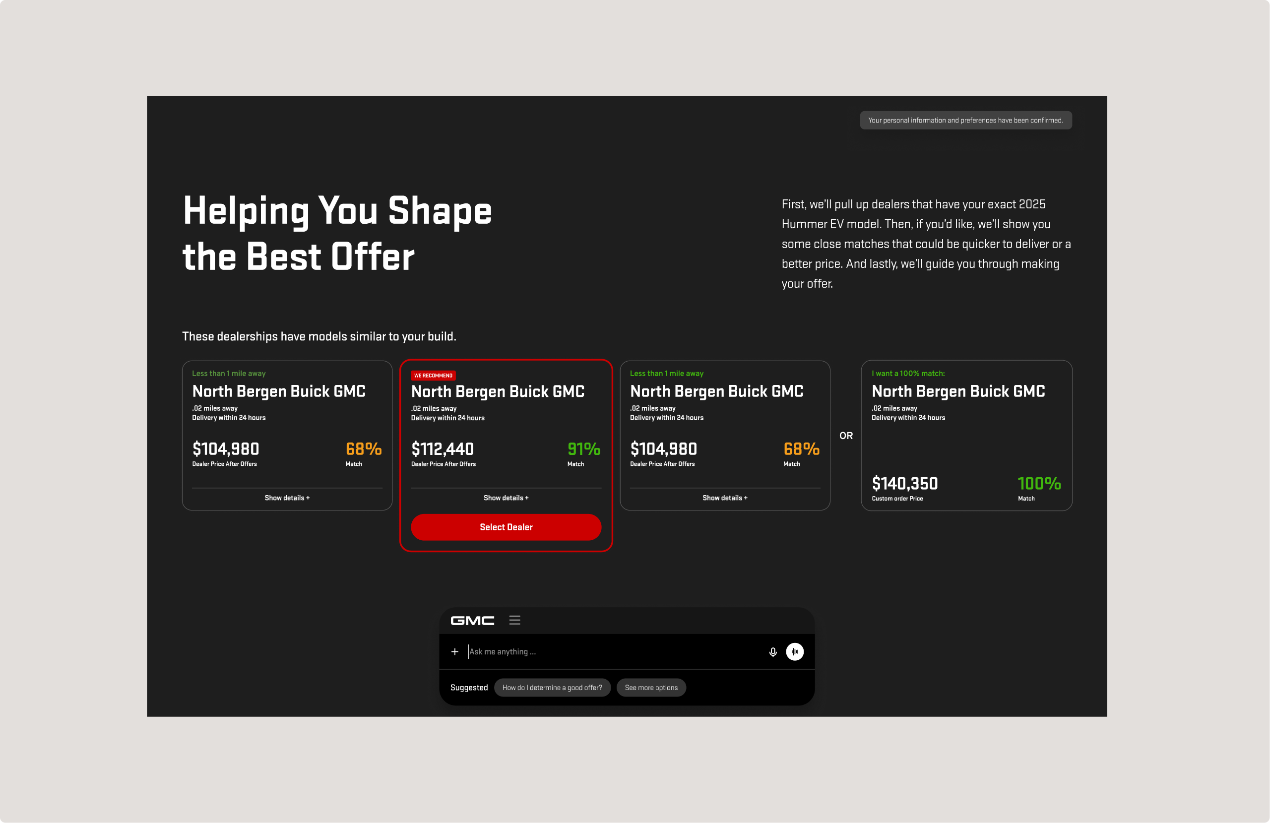 Stakeholders responded strongly to the clarity and prominence of the selected vehicle within the layout. The concept successfully won internal approval, and Buick was chosen as the first brand to move forward with fully fleshing out the AI-driven purchase vision beginning in 2026.