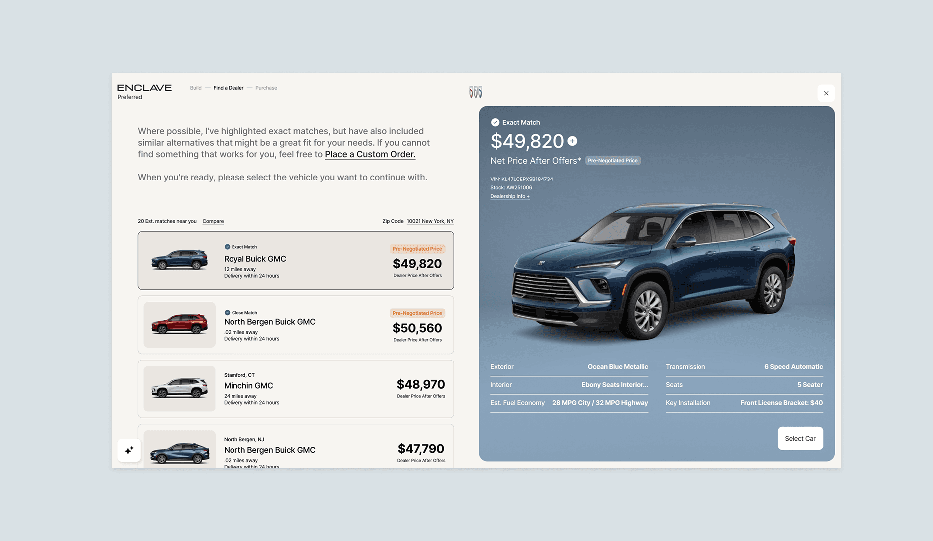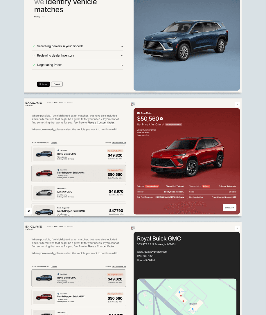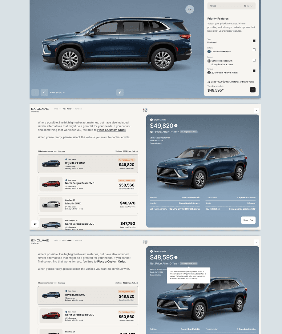 Stakeholders responded strongly to the clarity and prominence of the selected vehicle within the layout. The concept successfully won internal approval, and Buick was chosen as the first brand to move forward with fully fleshing out the AI-driven purchase vision beginning in 2026.